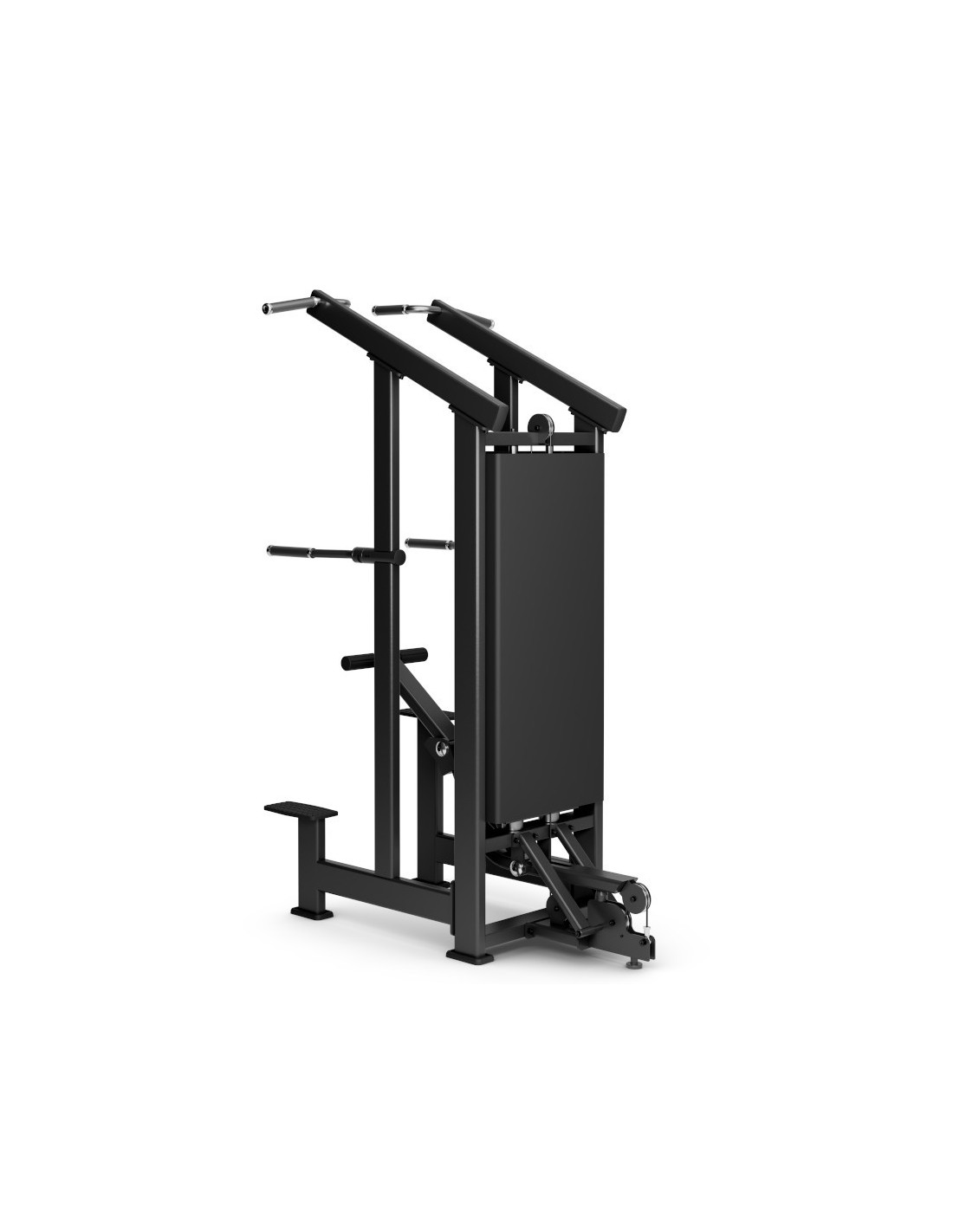 It includes an adjustable assistance platform, ideal for adapting the level of support to the user, as well as a dual access step, providing safe and comfortable entry to the machine. The unit is also equipped with stainless steel weight-stack guide rods, low-friction bushing plates and a magnetic safety weight selector with retention cable, ensuring maximum protection during training.