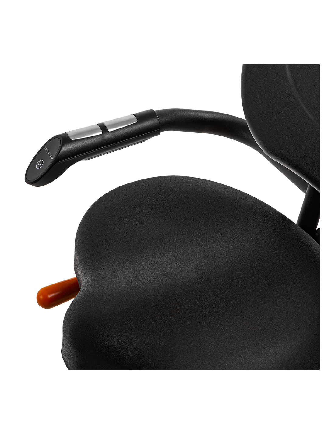 - Resistance adjustment buttons (+/−) integrated into the handlebars.