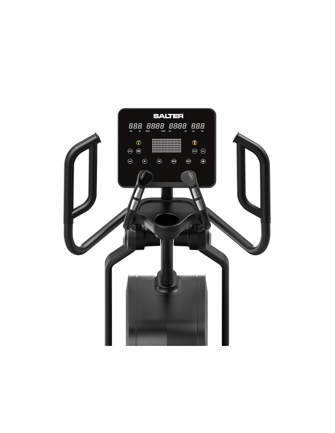 It is equipped with a dual heart-rate monitoring system, using contact sensors and a wireless system compatible with a chest strap (not included). A bottle holder is included, and the machine supports a maximum user weight of 200 kg.