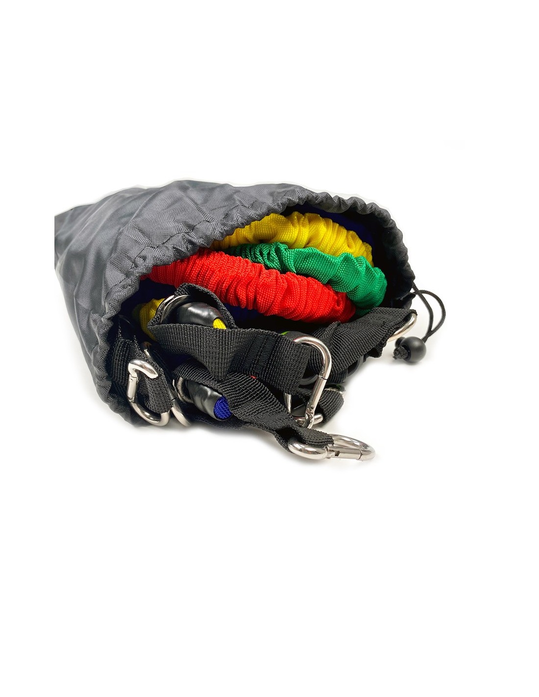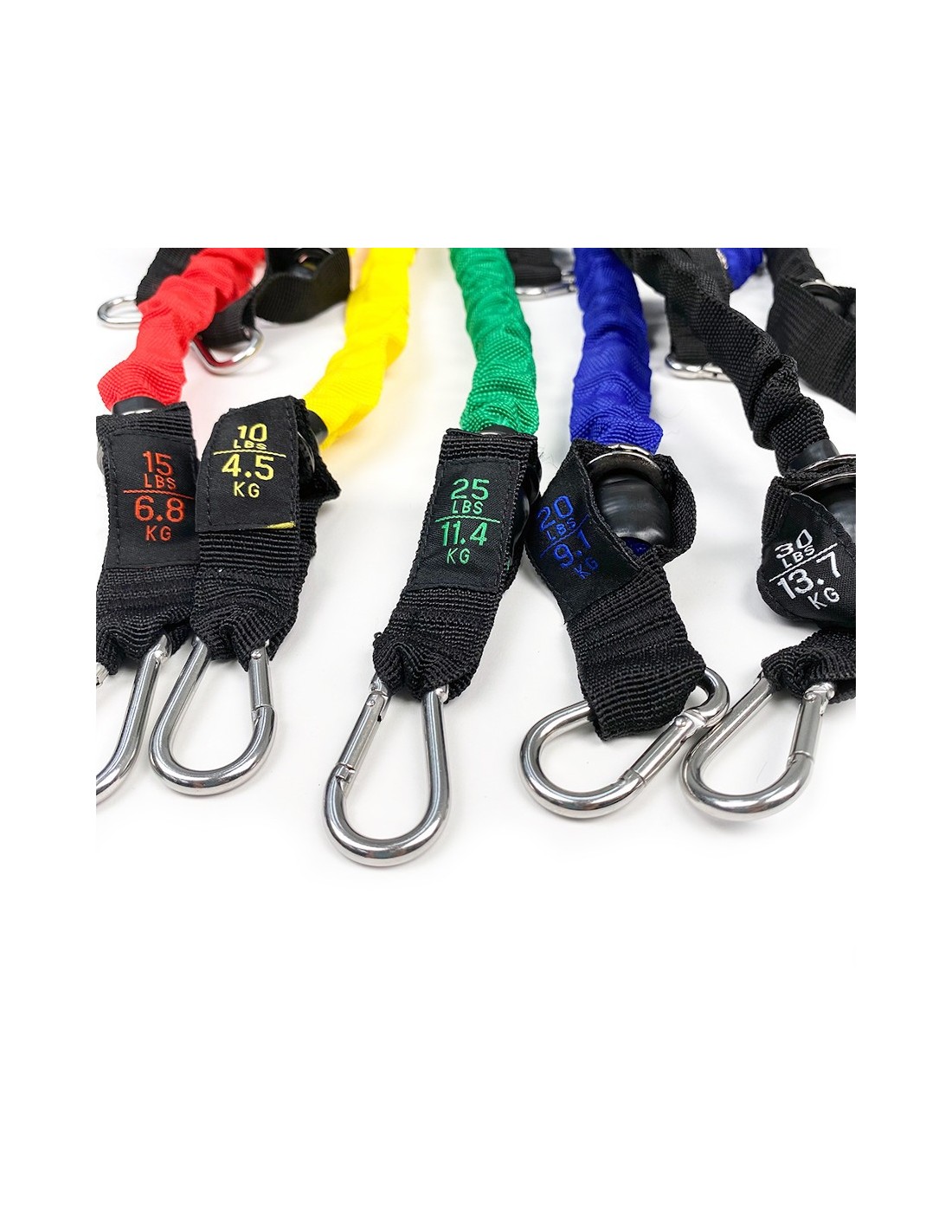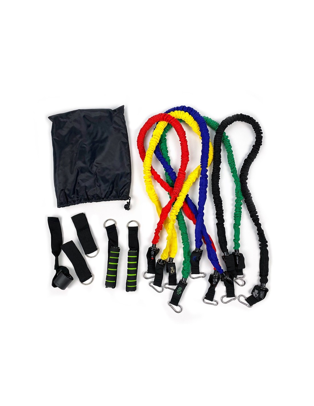 It includes five progressive resistance tubes, made of latex and wrapped in a durable fabric layer for added protection. Each band offers a different resistance level, from 4.5 kg to 13.7 kg, making it suitable for users of all fitness levels.