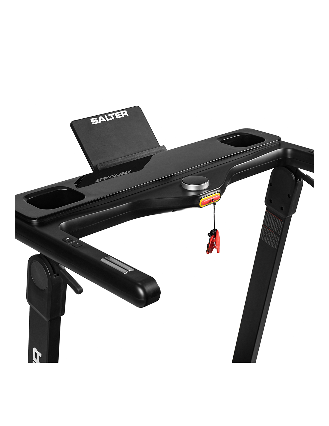 Designed for your comfort and safety, it features a safety key, mobile holder, dual bottle holder, transport wheels, and compact folding system. The running surface measures 130 x 48 cm, supports up to 120 kg, and is perfectly suited for home use.