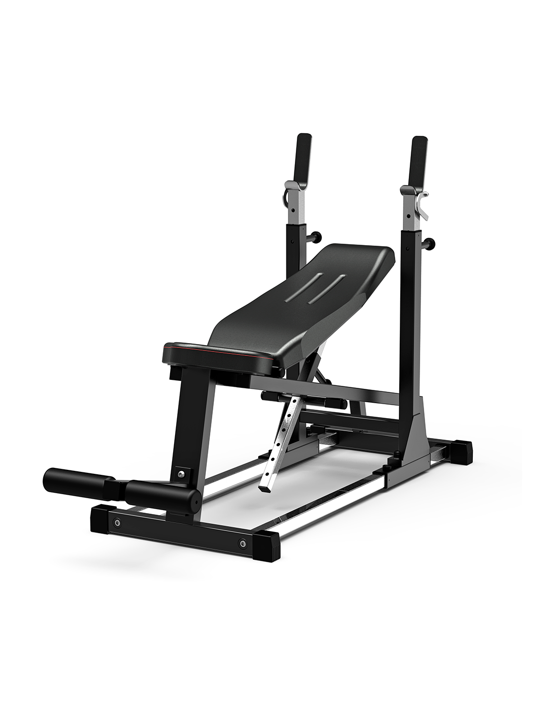 The barbell support is not only height-adjustable but also horizontally adjustable, ensuring optimal positioning of the bar at every bench angle. It also includes an integrated safety system for added confidence during training.