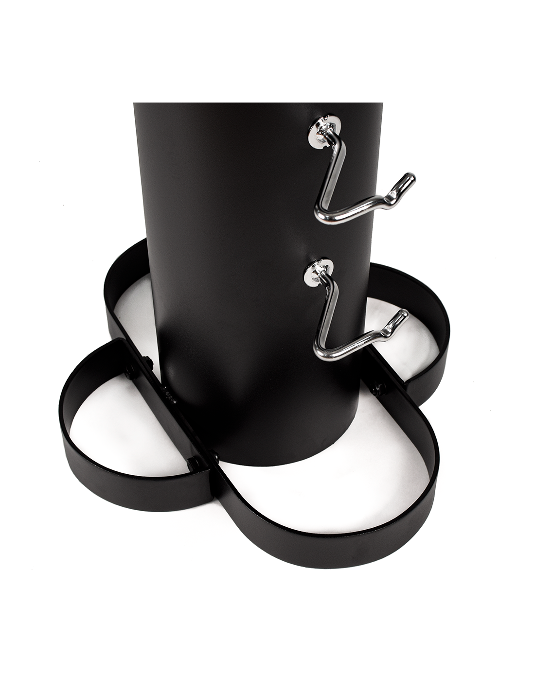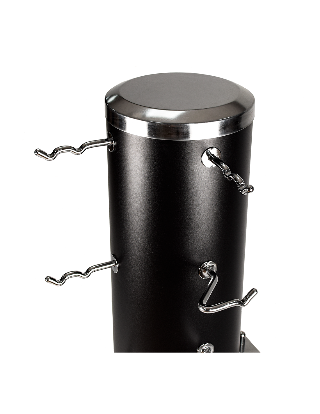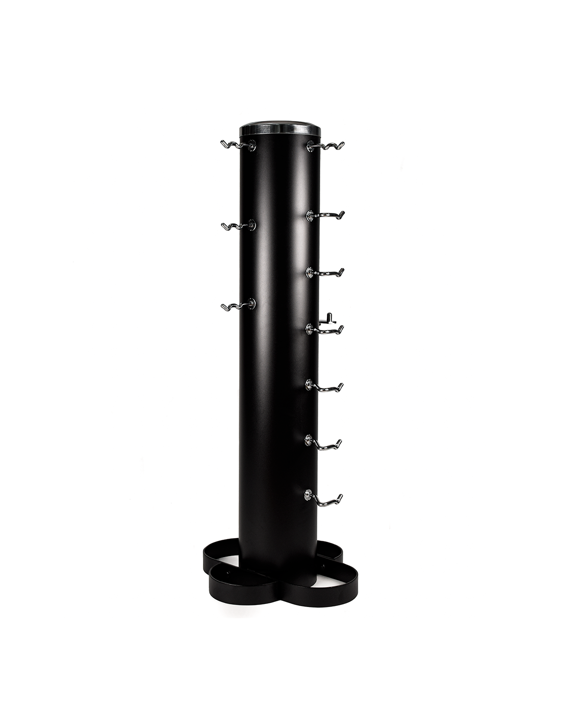 – Vertical tubular support with multiple slots for neatly storing different types of fitness handlebars.