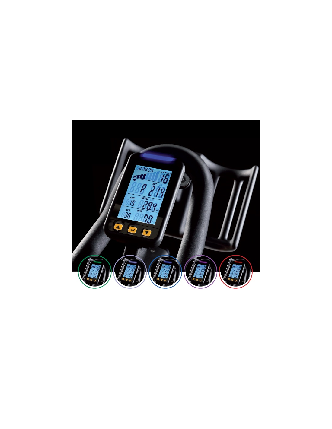 - Marcador con lectura de: Pulso, Velocidad, Velocidad media, RPM, RPM media, Tiempo, Calorías, Distancia, Vatios y nivel de freno (32 posiciones).