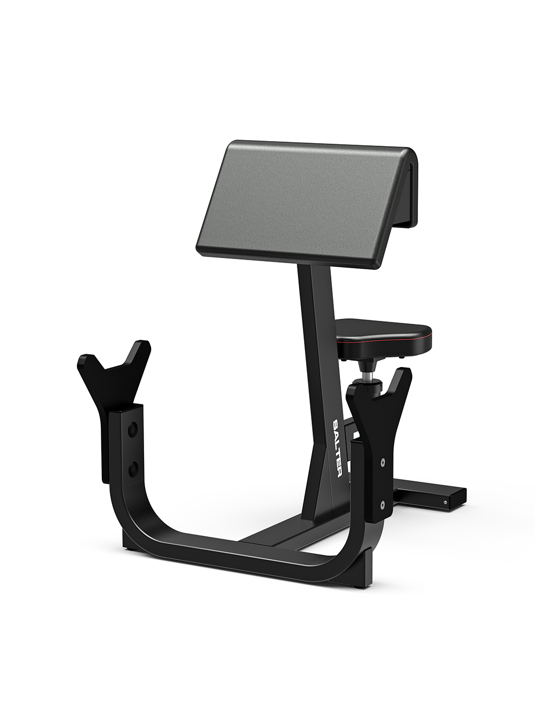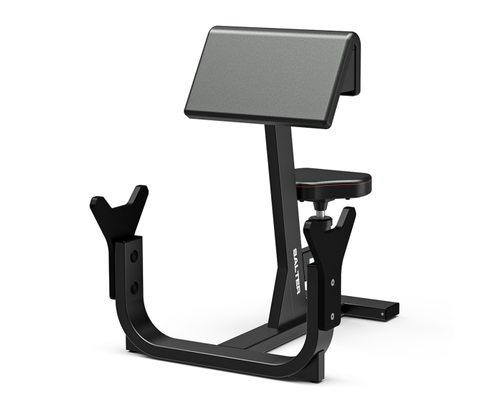 Banco Scott de diseño profesional con asiento regulable mediante pistón de gas, soporte de barra en fenólico y estructura de acero de 3 mm. Ideal para entrenamientos focalizados de bíceps.