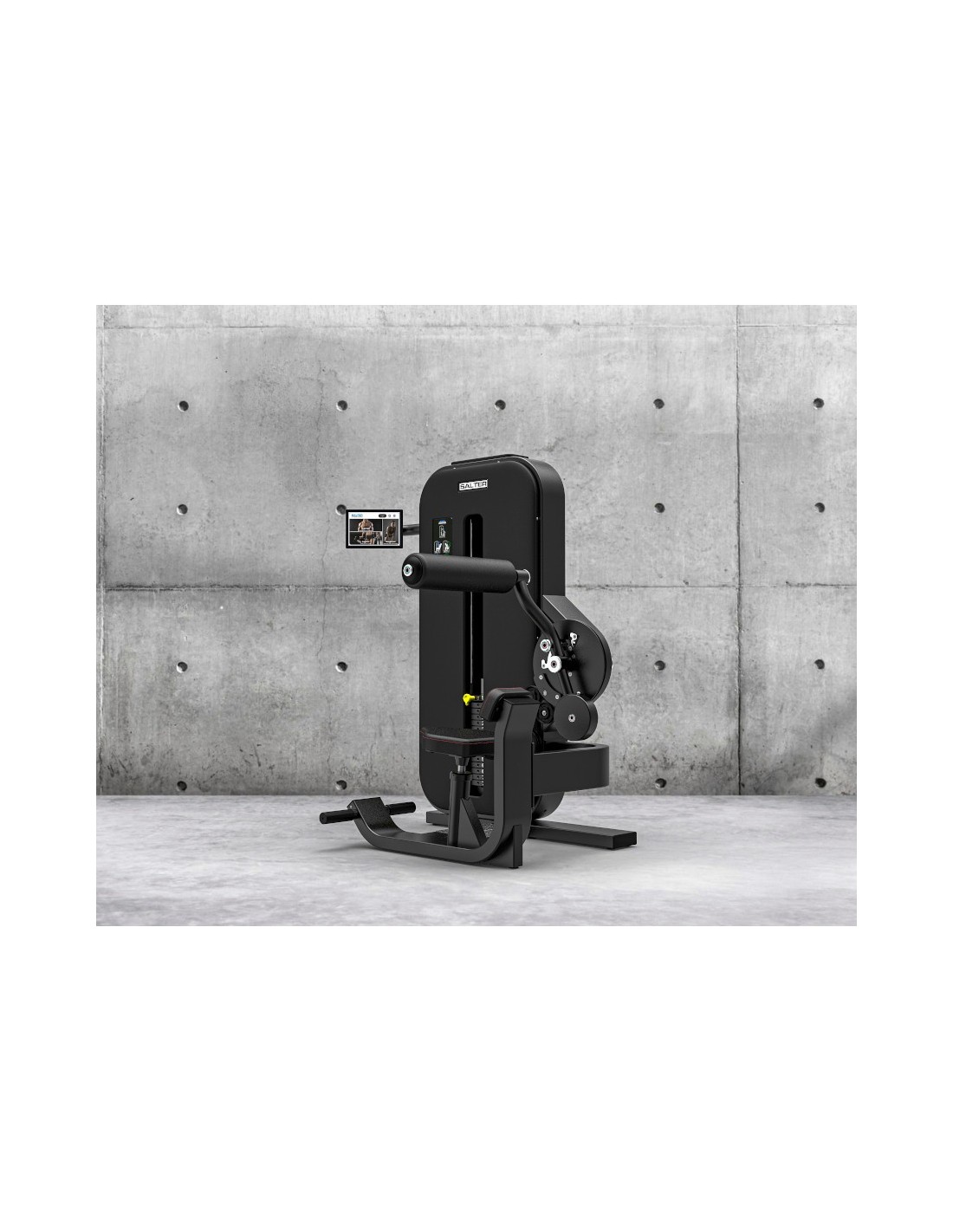 La estructura está fabricada con acero reforzado de 3 mm con tratamiento antioxidación y pintura al horno negro mate. Incluye un goniómetro de acero inoxidable para ajuste del ángulo de inicio del movimiento y un brazo de palanca con altura regulable, permitiendo una total adaptabilidad al ejercicio.