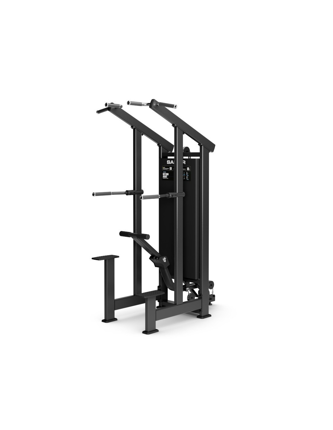 Dispone de carenados protectores de la carga, delanteros y traseros, que aumentan la seguridad y protegen los componentes internos. Los agarres inyectados en material de caucho no poroso y antideslizante garantizan un uso seguro y confortable. La máquina incorpora distintos agarres para dominadas, permitiendo variar el tipo de trabajo y la implicación muscular.