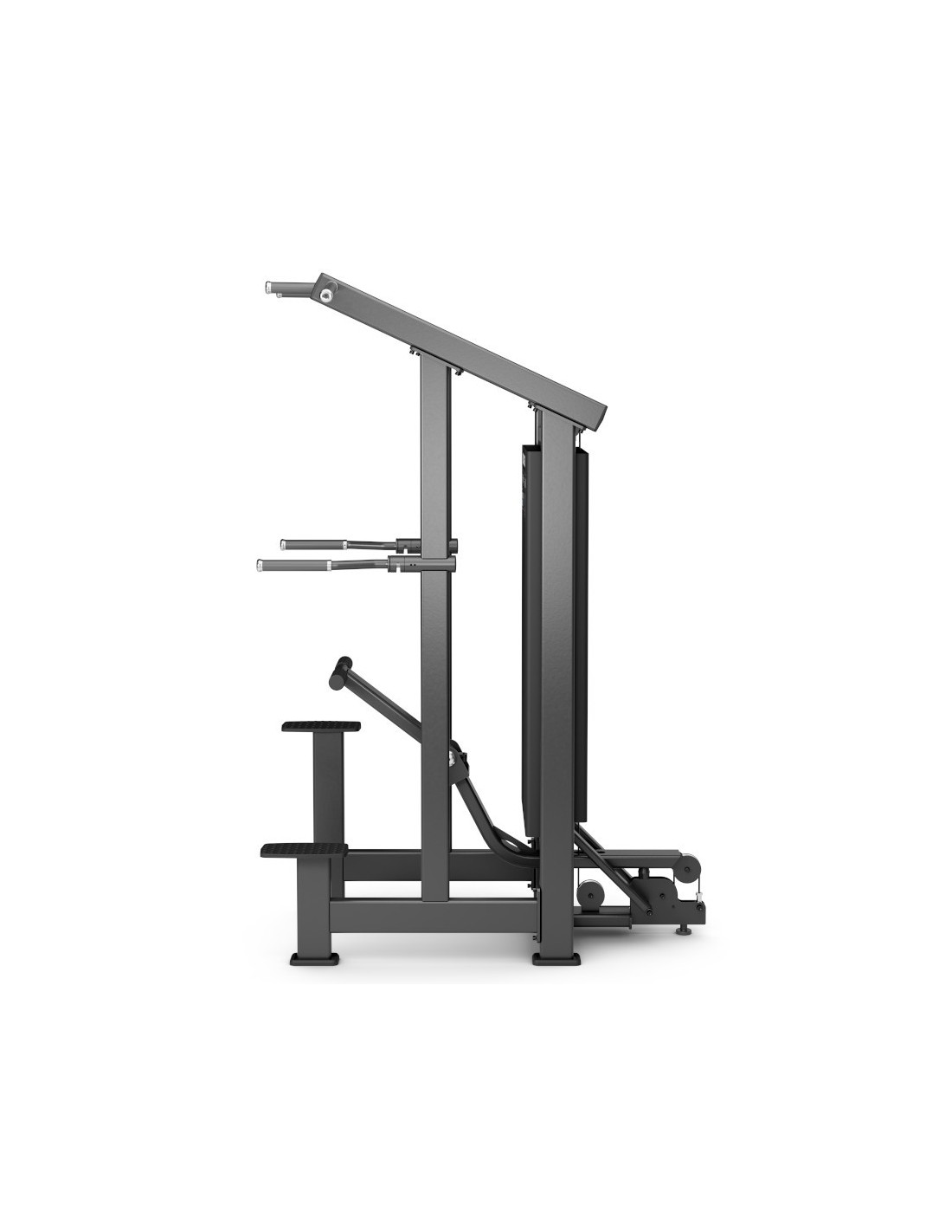 Incluye soporte de ayuda ajustable, ideal para adaptar el nivel de asistencia al usuario, así como doble escalón de acceso, que facilita una entrada cómoda y segura a la máquina. Dispone además de guías de placas en acero inoxidable, placas con casquillos de baja fricción y selector de carga con sistema magnético de seguridad y cable de sujeción, ofreciendo máxima protección durante el entrenamiento.