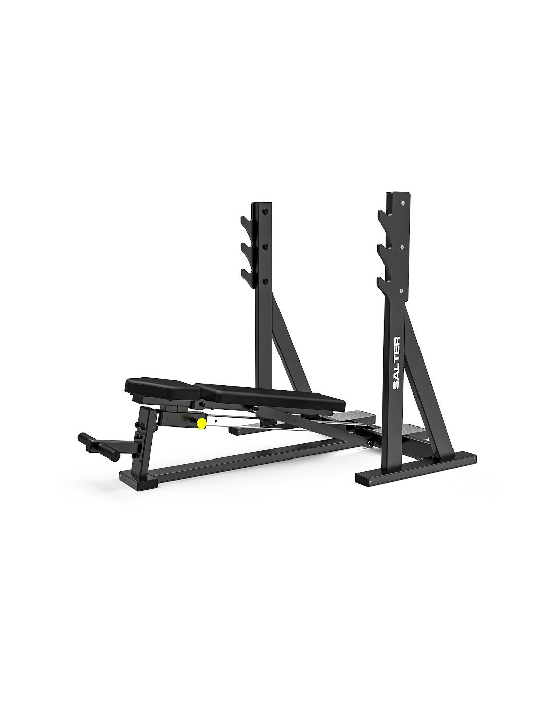 Banc polyvalent pour développé couché, incliné et décliné. Structure en acier renforcé, revêtement antibactérien, et dossier réglable de -10° à 35°. Comprend un support de barre à 3 hauteurs, des plateformes d'assistance et un appui-pieds.