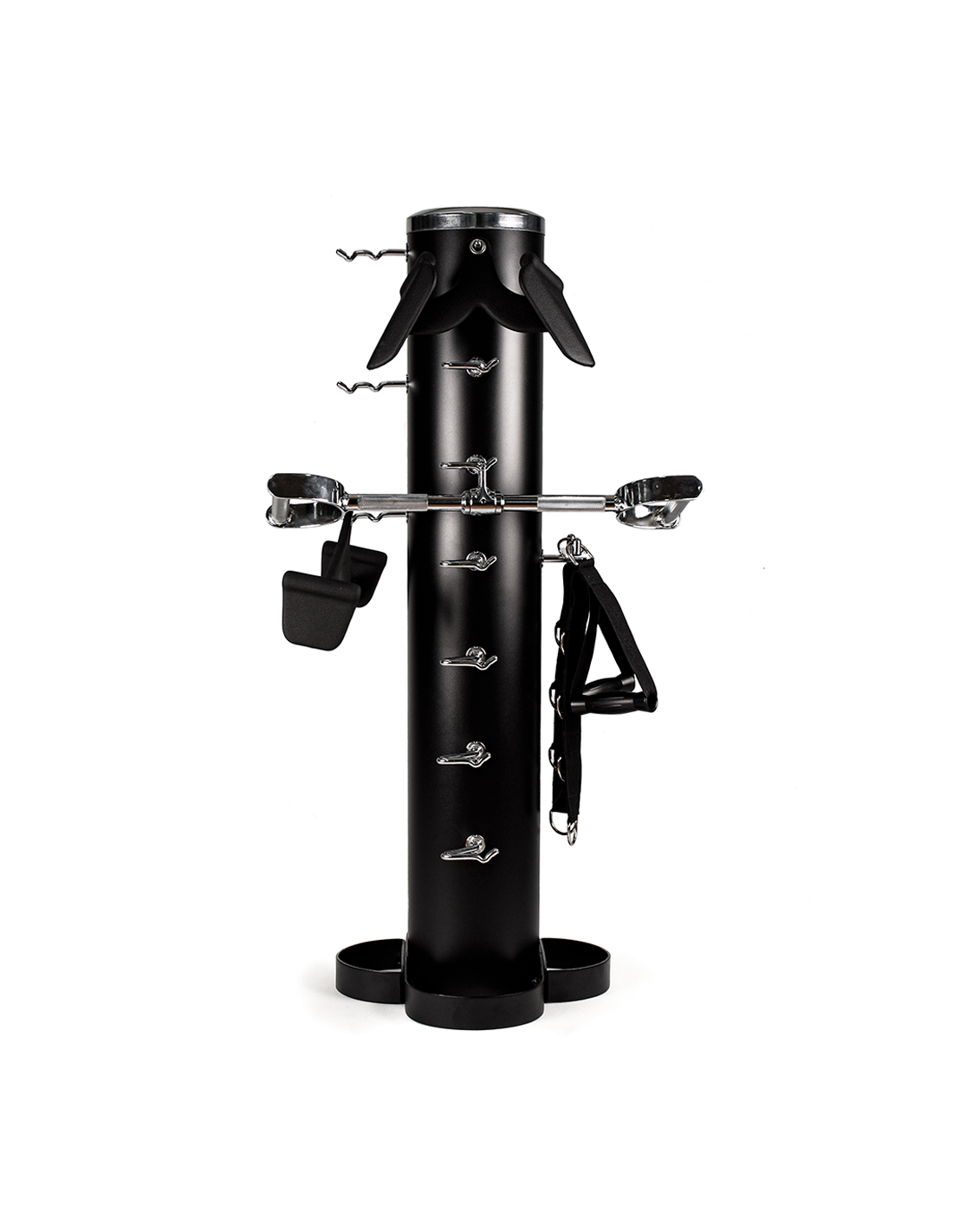 – Support tubulaire vertical avec plusieurs emplacements pour ranger soigneusement différents types de guidons de fitness.