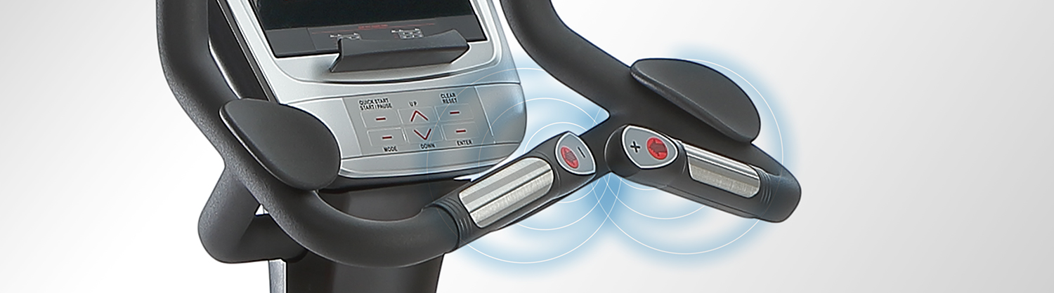 - Boutons d’accès rapide (+/-) intégrés au guidon pour ajuster facilement la résistance pendant l’effort.
