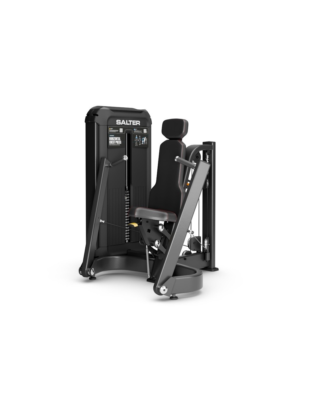 Le mouvement convergent de la presse assure une trajectoire naturelle et biomécaniquement correcte. Elle comprend des guides de plaques en acier inoxydable, des plaques avec bagues à faible friction et un sélecteur de charge avec système magnétique de sécurité et câble de fixation, garantissant une utilisation sûre à tout moment.