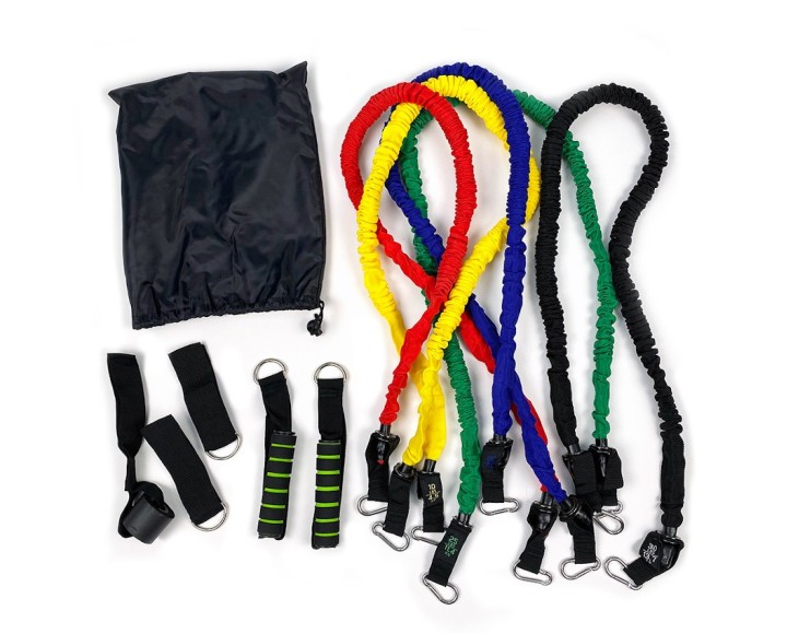 Il comprend cinq tubes de résistance progressive, fabriqués en latex et protégés par un revêtement en tissu durable. Chaque tube offre un niveau de résistance différent (de 4,5 kg à 13,7 kg), permettant de moduler l’intensité ou d’adapter l’exercice à l’utilisateur.