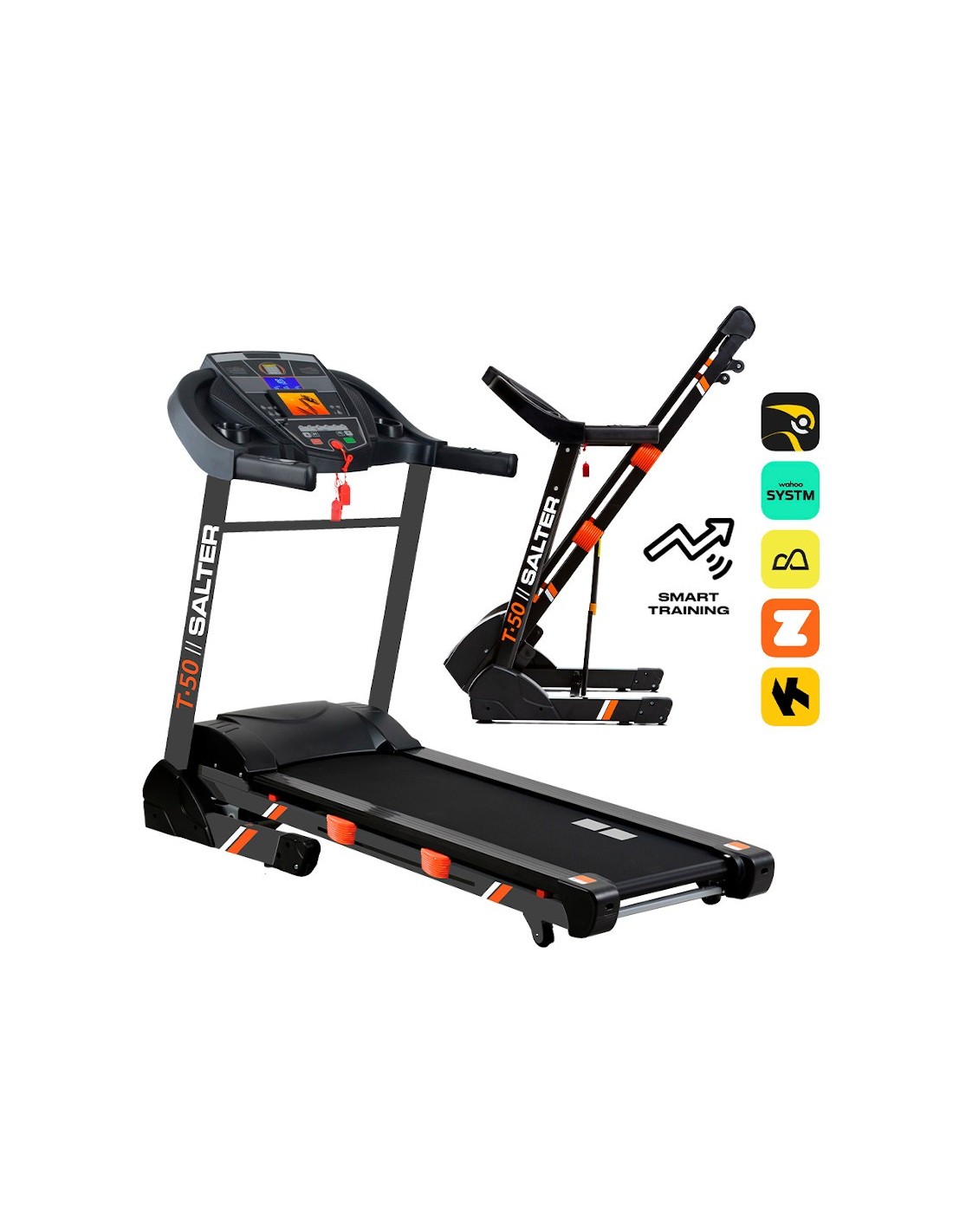 La T-50 es la cinta de correr ideal para usuarios domésticos que buscan una experiencia de entrenamiento completa, conectada y segura. Equipada con un motor DC de 2,5 CV, alcanza velocidades de hasta 18 km/h e incorpora 18 niveles de inclinación electrónica, perfectos para simular rutas reales y variar la intensidad.