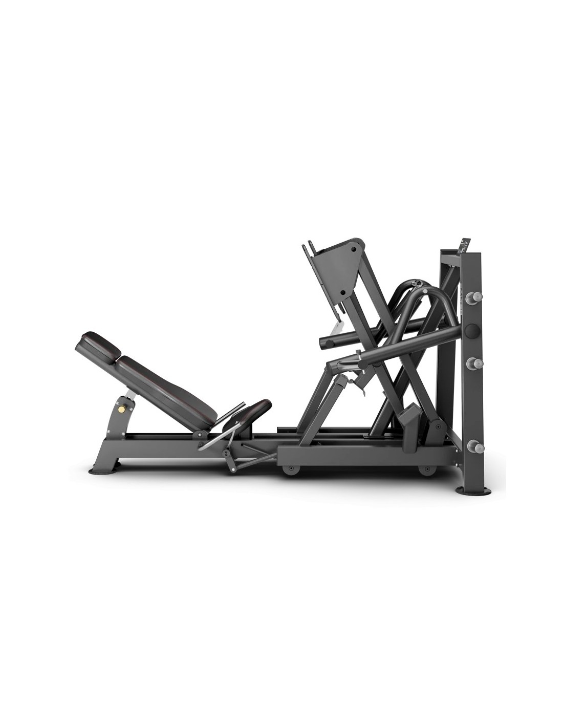 - Soporte para discos integrado. Permite almacenar la carga en la propia máquina, manteniendo los discos siempre a mano y el área de trabajo ordenada y segura. Facilita cambios de peso rápidos entre series y evita desplazamientos innecesarios por la sala.
