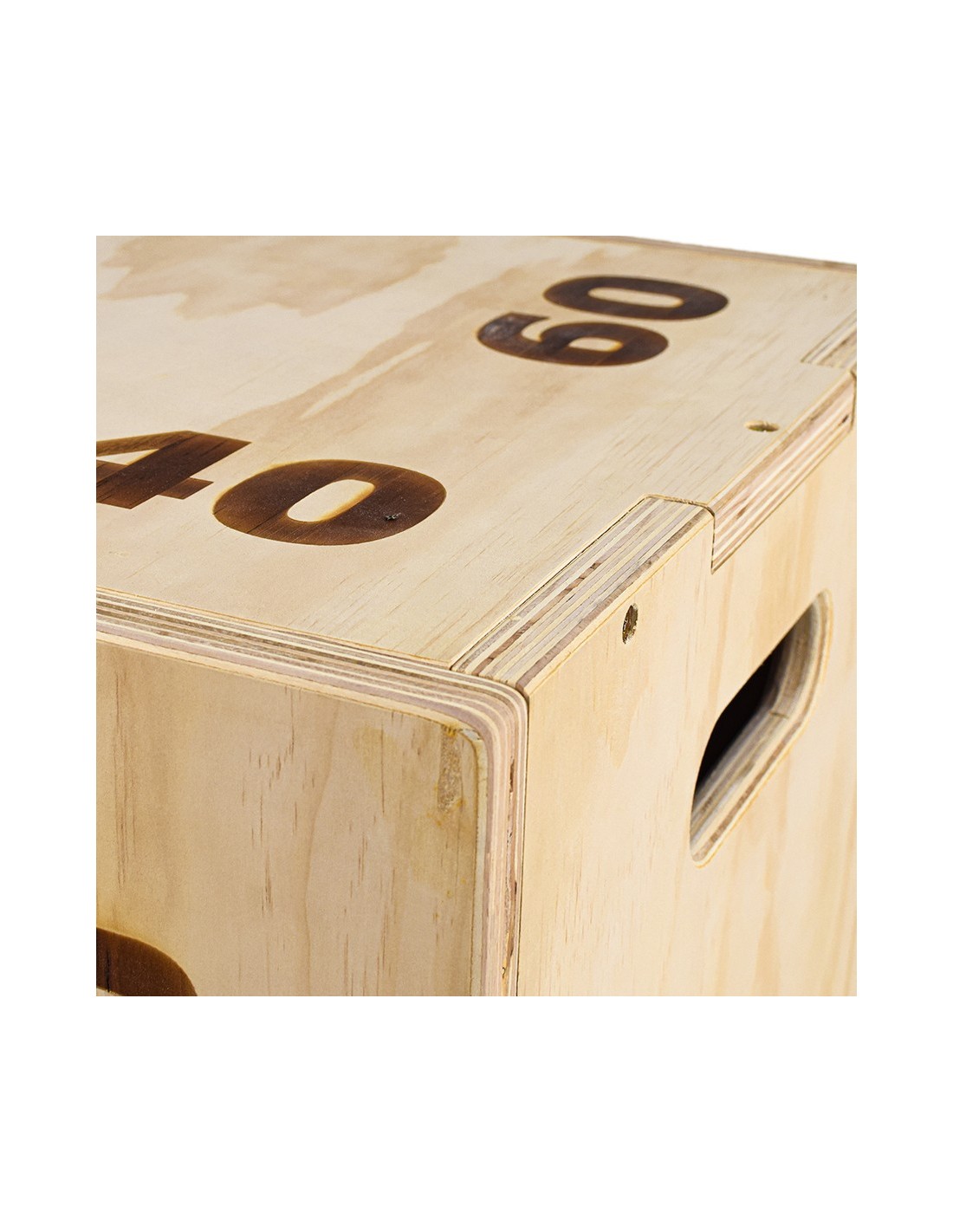 Su diseño permite utilizar el cajón en tres alturas distintas (40, 50 y 60 cm) simplemente girando la caja, lo que lo convierte en una herramienta versátil para diferentes niveles de dificultad y tipos de ejercicio. Cada lado muestra la altura impresa, facilitando una identificación visual rápida.