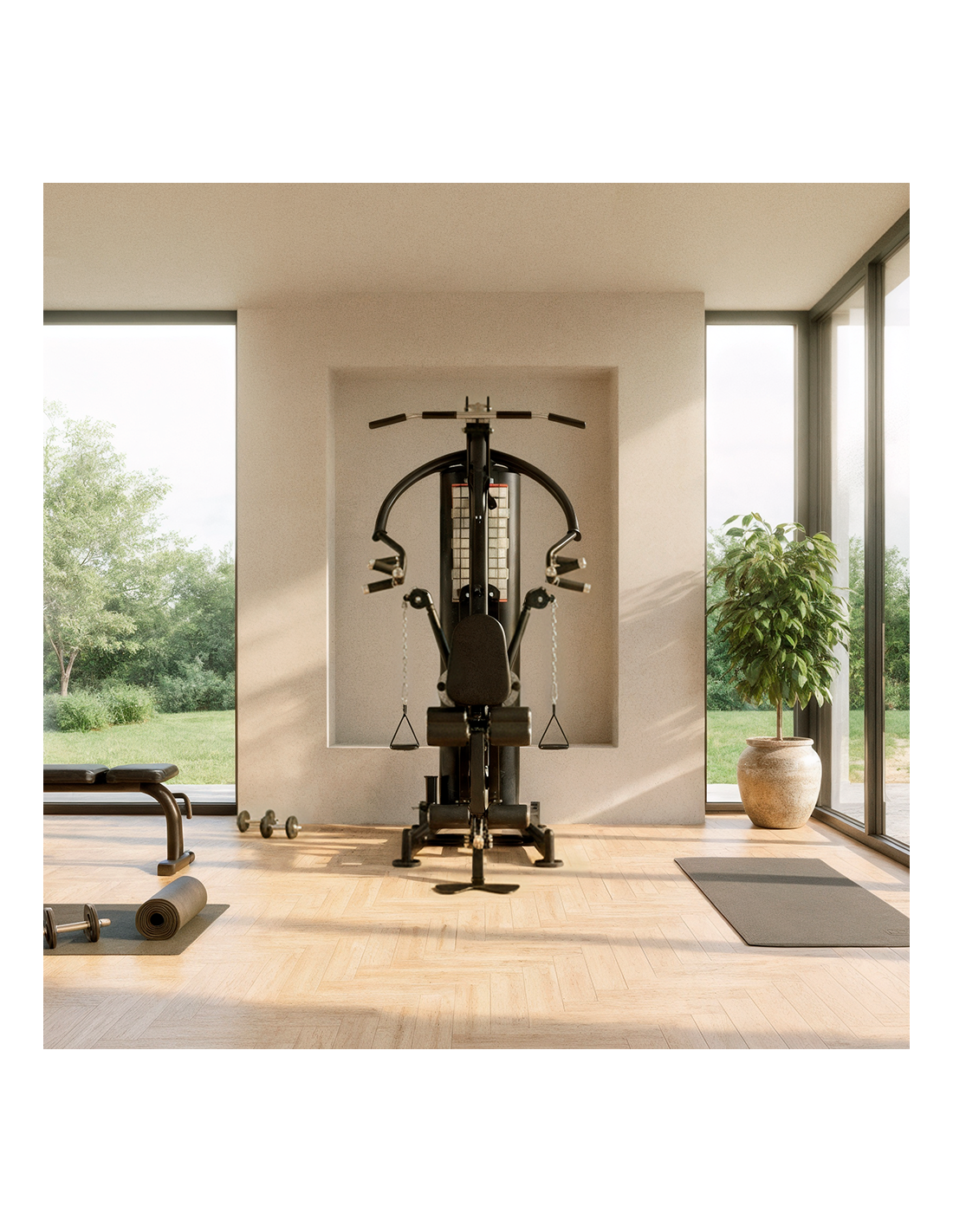 El diseño incluye un pictograma guía de estaciones básicas y la posibilidad de ampliar funcionalidades mediante accesorios opcionales como la prensa horizontal o la polea regulable. Una máquina versátil, compacta y profesional para un entrenamiento de fuerza completo.
