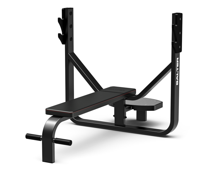 anco profesional para press horizontal. Estructura robusta, tapicería antibacteriana certificada y soporte para barra a dos alturas. Incorpora plataforma de ayuda antideslizante y niveladores regulables.