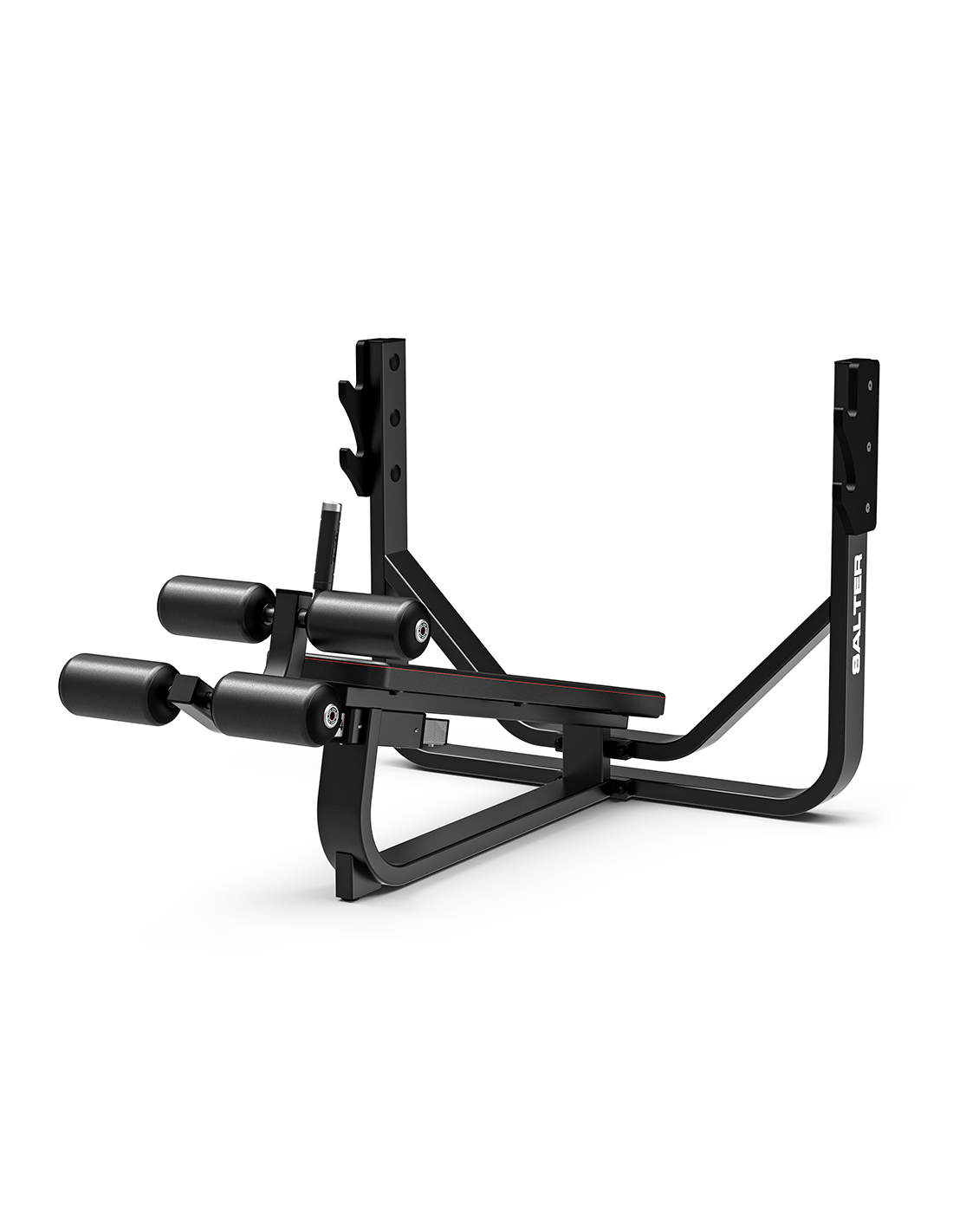 Banco profesional diseñado para entrenamientos de press declinado con barra. Fabricado con chasis de acero de 3 mm y tapicería antibacteriana, incluye soporte para barra a 2 alturas en compacto fenólico, apoya piernas ajustable y niveladores en la base.