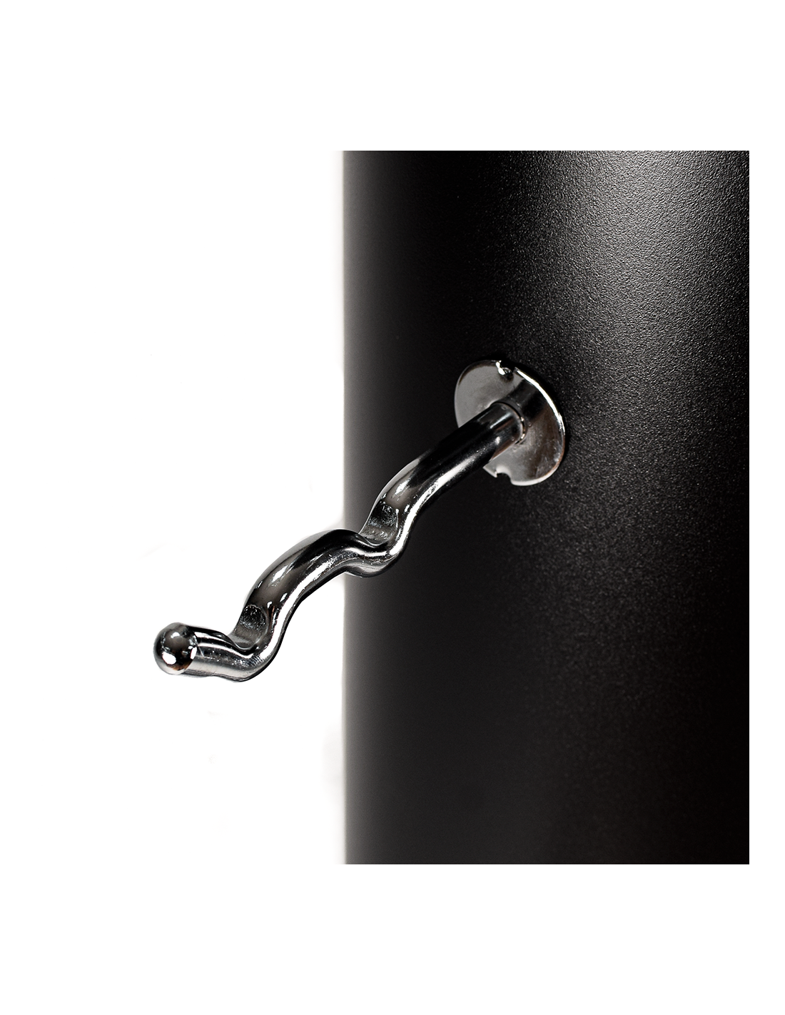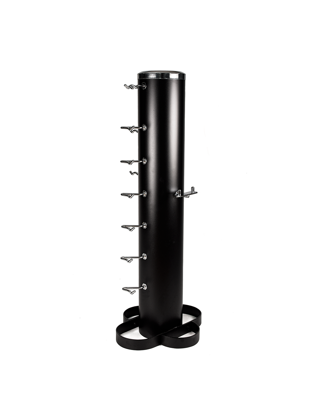 – Soporte vertical de estructura tubular con múltiples alojamientos para guardar de forma ordenada los distintos tipos de manillares (manerales) fitness.