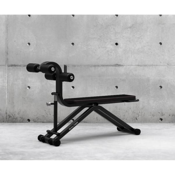 Banco específico para abdominales con inclinación regulable, apoyapiés de poliuretano, agarres antideslizantes y ruedas de transporte. Diseño profesional y máxima estabilidad.